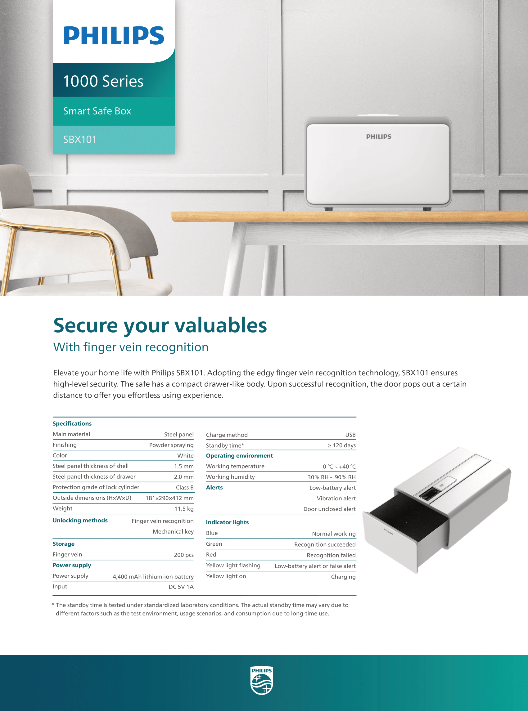 Elevate your home life with Philips SBX101. Adopting the edgy finger vein recognition technology, SBX101 ensures high-level security. The safe has a compact drawer-like body. Upon successful recognition, the door pops out a certain distance to offer you effortless using experience.